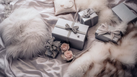Top view of beautifully wrapped gift packages in silver and turquoise, adorned with luxurious ribbons, placed among exquisite tree trimmings and delicate ornaments. The scene radiates holiday splendor.