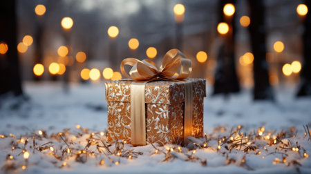 A beautifully wrapped gift box adorned with a golden ribbon sits among pinecones and snow, creating a cozy holiday atmosphere with sparkling lights in the background.