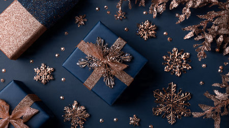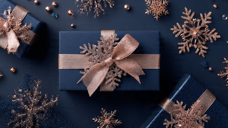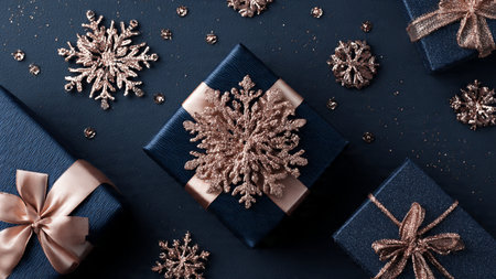Glamorous holiday aesthetic with gifts and rose-gold snowflakes on a deep blue background.