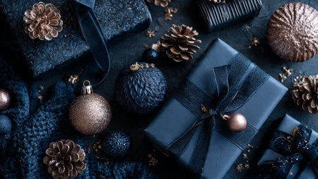 Elegant Navy Blue Gift Boxes With Golden Bows and Pine Branches on a Festive Background.