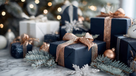 A sophisticated monochrome setup with subtle rose-gold accents and minimalistic gift wrapping for a clean, upscale holiday look.