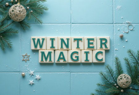 This enchanting winter magic scene features decorative letters, pine elements, and charming ornaments. Perfect for seasonal themes and festive projects.