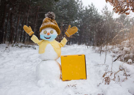 Happy cute snowman in a yellow knitted hat, jacket, mittens and a medical mask with a drawn smile. Nearby is a bright yellow cardboard box for the inscription of the text. Winter postman