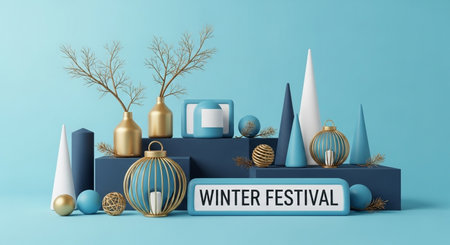 Winter sale background with blue podium and christmas decoration. 3D Render