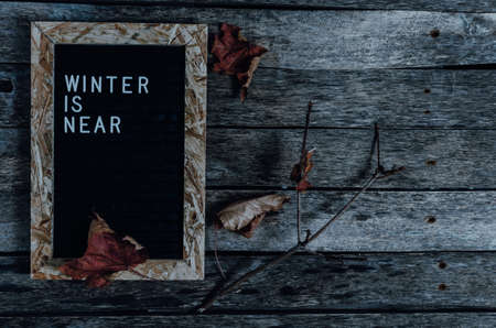 Letter board with white lettering winter is coming on old wooden background. Branch and fallen maple leaves.