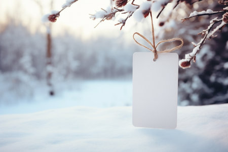 Blank card hanging on a branch covered with snow in winter forest