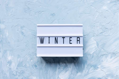 Text WINTER on white and blue abstract minimalistic background. Winter season and holidays concept. Flat lay, copy space