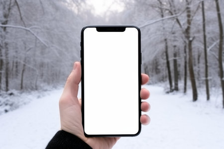 Blank template mockup phone white screen close-up on the background of a winter forest. The hand of a man walking in nature holds a smartphone. Generative AI