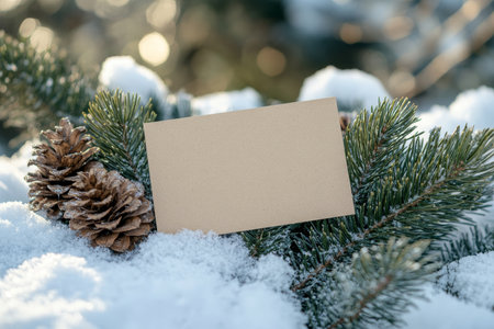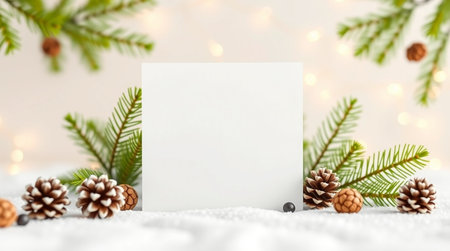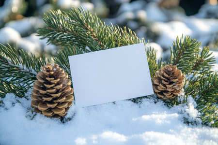 Winter scene blank greeting card on snowy pine branch with pinecones and frosty holiday vibes