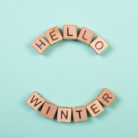 Hello winter word written on wood block. Greeteng card concept on mint background.