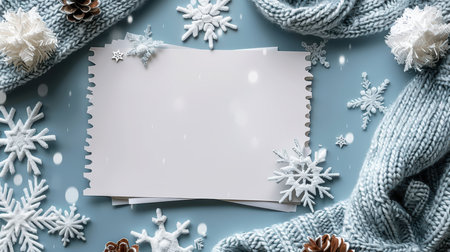 A cozy winter scene featuring snowflakes, a blank paper space, and pinecones. Perfect for creating festive cards or holiday decorations.