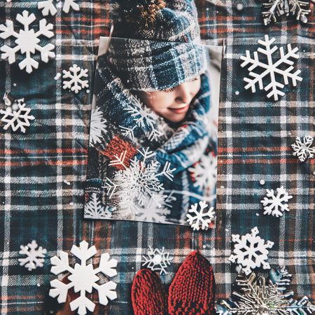 Cozy Winter Composition with Knitted Accessories, Snowflakes, and Seasonal Decor Elements