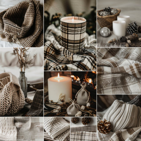 Cozy Winter Decor Collection with Knitted Throws, Candles, and Pine Cones for a Warm Atmosphere