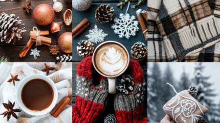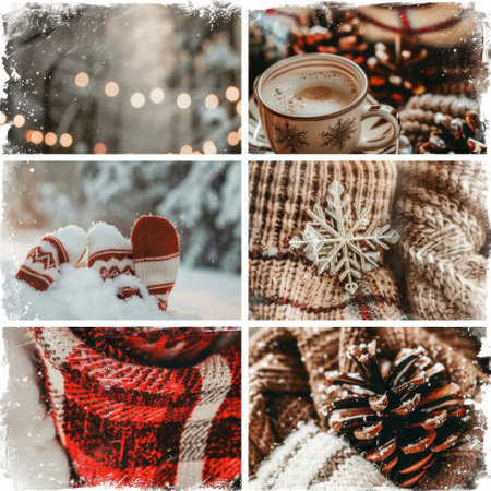 Cozy Winter Collage. Hot Cocoa, Snowy Mittens, Pinecones, and Soft Woolen Scarves with Festive Lights