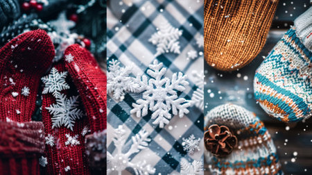Winter Knitted Mittens and Hats with Snowflakes on Cozy Plaid Background