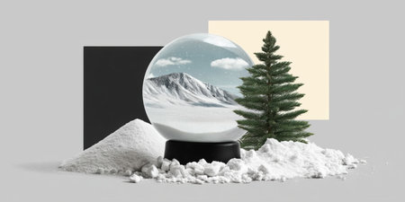 Collage snow globe scene with pine tree mountain landscape in minimal still life composition joyful mood