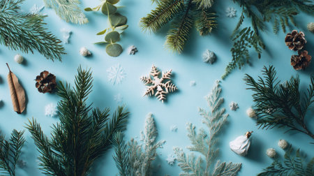 A vibrant flat lay featuring a variety of greenery and winter decorations, including a delicate snowflake, creating a festive and cozy atmosphere.