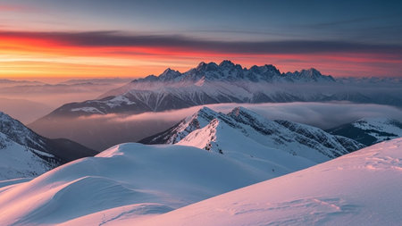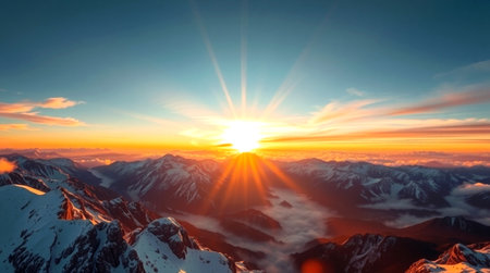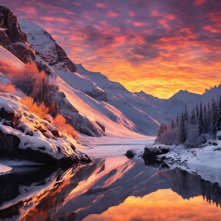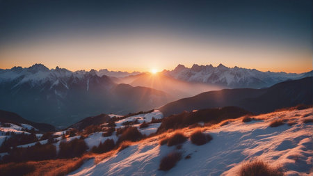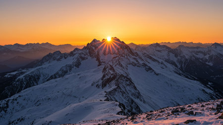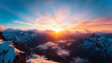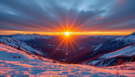 A stunning view of a vibrant sunrise illuminating a snowy mountain landscape, showcasing the beauty of nature's colors and peaceful atmosphere.