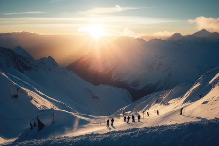 Snow mountain and sunset sky abstract background. Season and environment concept. Generative ai.