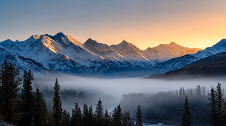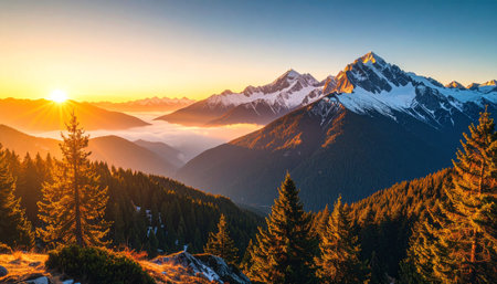 Snow capped mountain peaks at sunrise with mist filled valleys, golden light, pine forests