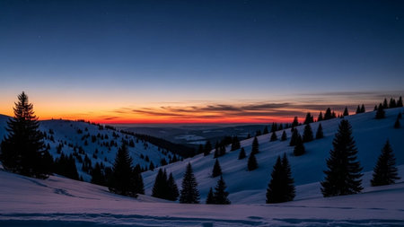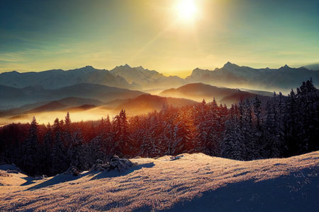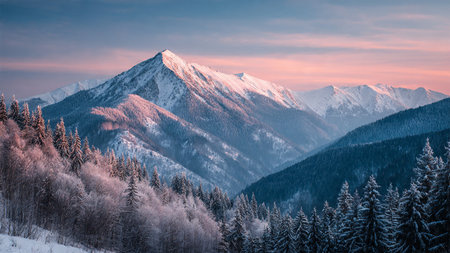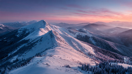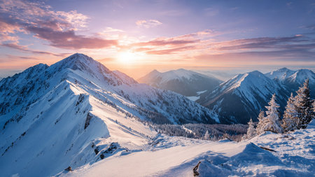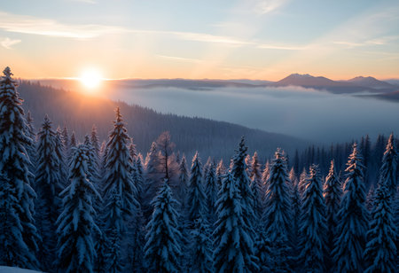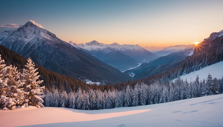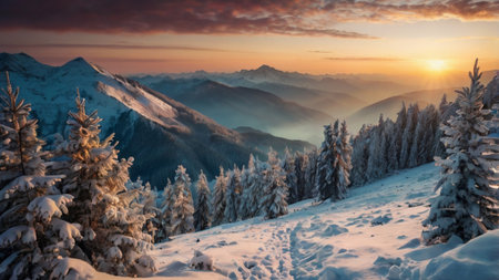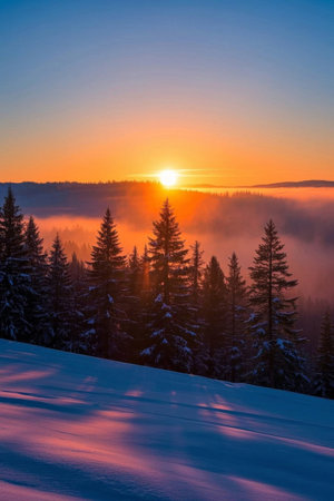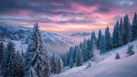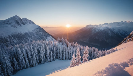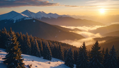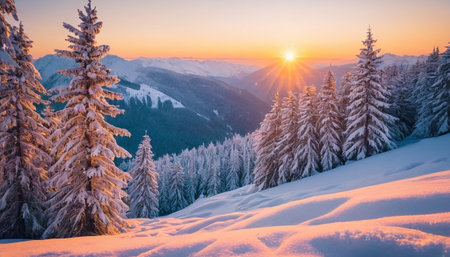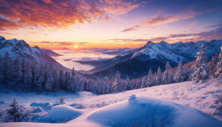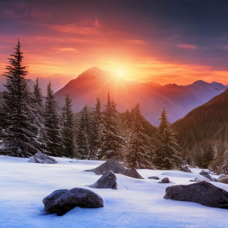 Breathtaking winter sunrise over snowy mountains and pine forest, capturing the beauty of nature with vibrant colors and dramatic skies.