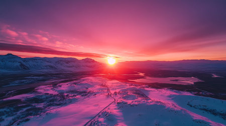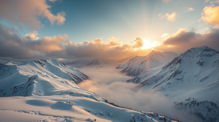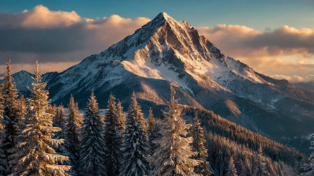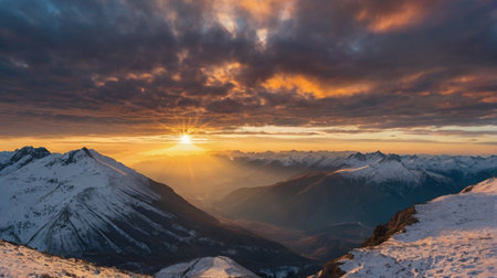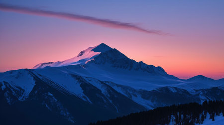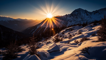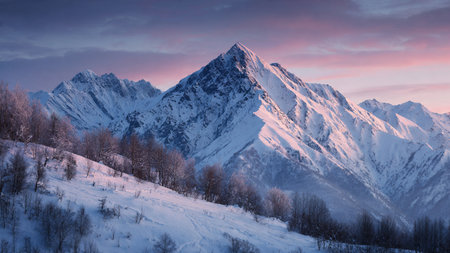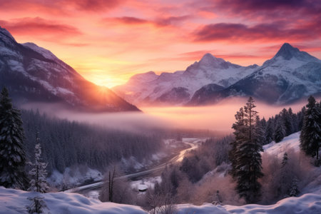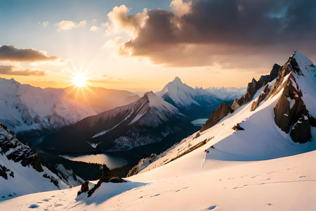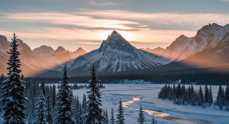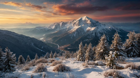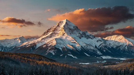 An AI generated illustration of A stunning winter sunset featuring a snow-covered mountain illuminated by the setting sun