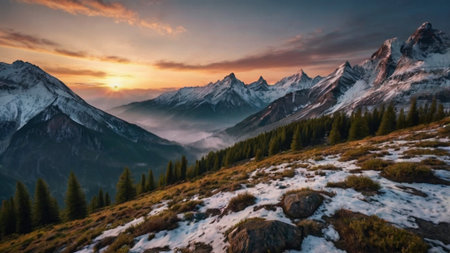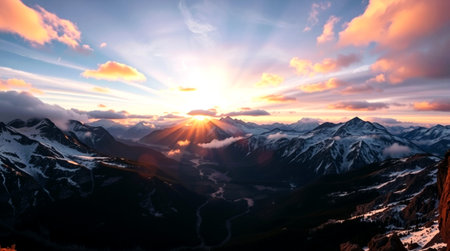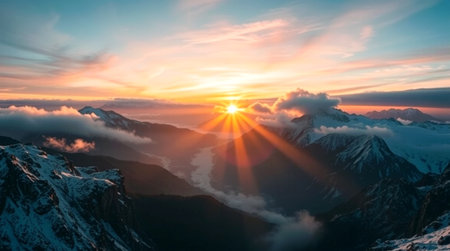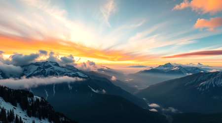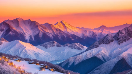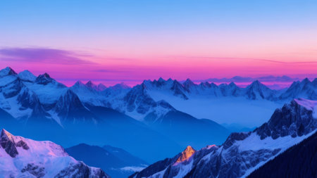 An AI generated illustration of a breathtaking view of a snow-capped mountain range at sunset