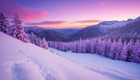A winter valley unfolds under a vibrant purple and pink sunset, with snow-covered pine trees dotting the slopes.