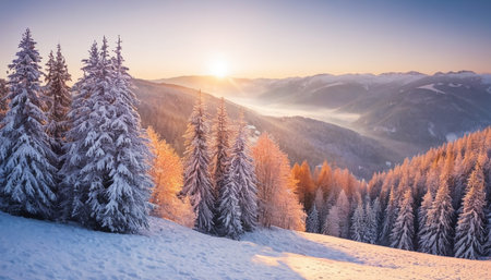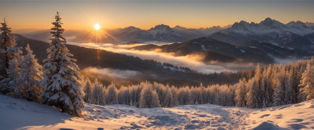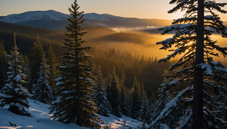 The golden rays of a rising sun paint a snow-covered mountain landscape with frosted evergreen trees and a misty valley below.
