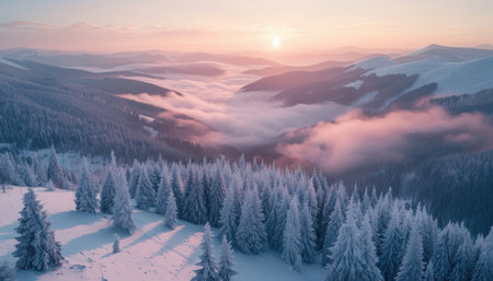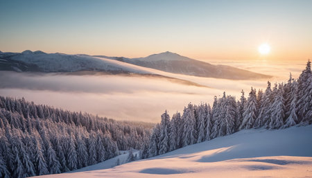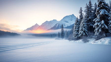 A serene winter dawn bathes a snow-covered mountain range in soft light, with a layer of mist and frosted pine trees.