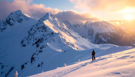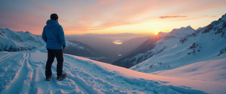 A lone figure stands on a snow-covered ridge, gazing at a breathtaking sunset that paints the sky in hues of orange and pink. The surrounding peaks, draped in white, create a serene backdrop, while the valley below hints at a tranquil lake reflecting the vibrant colors of dusk.