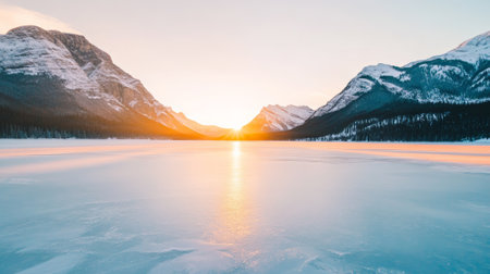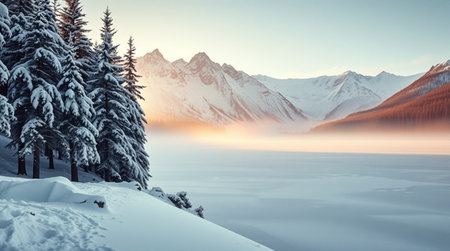 Low sun illuminating frozen lake surface between snow covered mountains and pine forests at sunrise, creating a beautiful reflection of golden light on ice