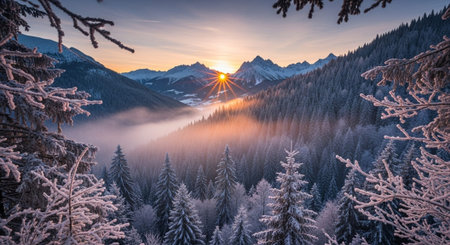 Winter Wonderland. Scenic Sunset Over Snow Covered Pine Forest and Misty Mountain Peaks.