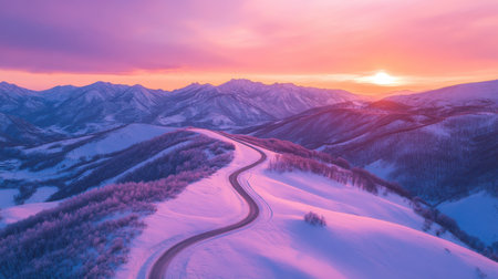 A winding road traverses serene snowy mountains, illuminated by a pastel sunset. The crisp landscape invites tranquility and offers a breathtaking vista of nature's beauty.