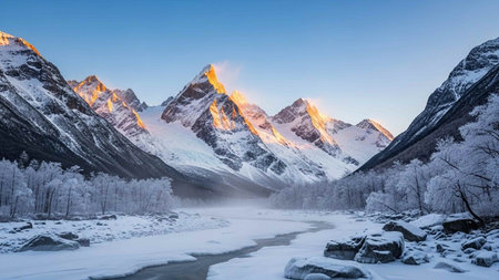 A serene winter landscape featuring a snow-covered mountain range, frozen river, and frosted trees, illuminated by the warm glow of sunrise.