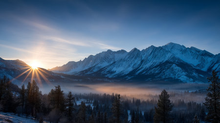 A winter mountain vista at sunrise, with a sunburst casting warm light over snow-laden evergreen trees and distant peaks.