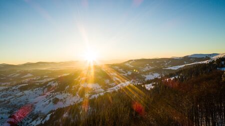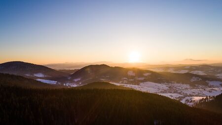 Aerial view sunny beautiful landscape of winter hills and mountains with forest thickets on a frosty winter evening against a blue sky and the setting sun. Place for advertising