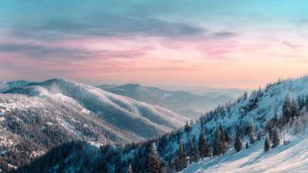 Mesmerizing soothing landscape of hills and mountains covered with snow sunny warm winter evening. Concept of outdoor recreation outside the city in winter. Advertising space