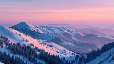 A wintry sunrise casting a soft pink light over snow-covered hills and mountains