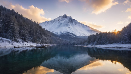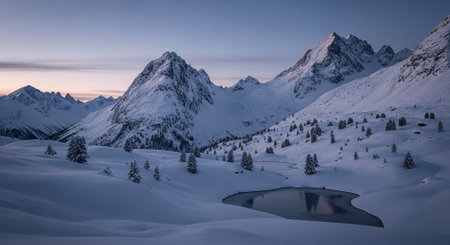 This stunning winter landscape features snow-capped mountains with a calm lake reflecting the soft dawn light, creating a tranquil and peaceful atmosphere ideal for nature lovers.