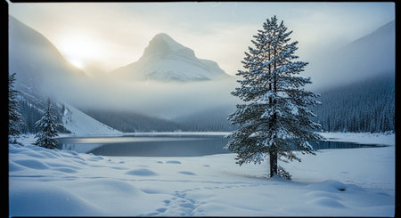 Foggy winter landscape with frozen lake and snow covered mountains.