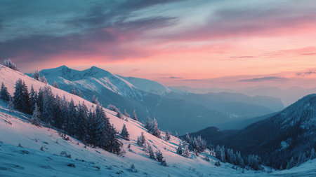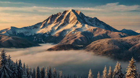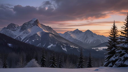 Snowy Mountain Landscape with Majestic Peaks and Pine Trees in Winter Wonderland, Concept of Tranquil Nature, Alpine Adventure, Pristine Wilderness.