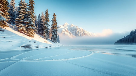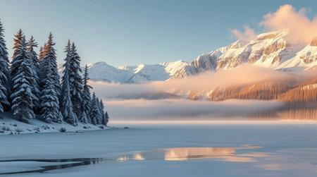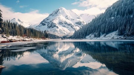 Beautiful winter landscape with snow-capped mountains and frozen lake