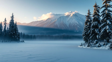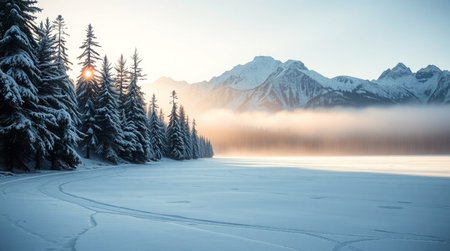 Foggy winter landscape with frozen lake and mountains at sunrise.