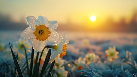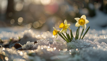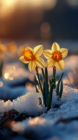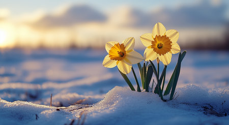 Two daffodils bloom beautifully amidst a snowy landscape, glistening in the sunlight of early spring as the sun sets. This moment captures the contrast of winter and the promise of new life.