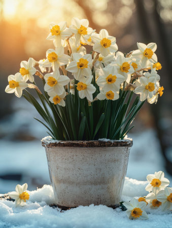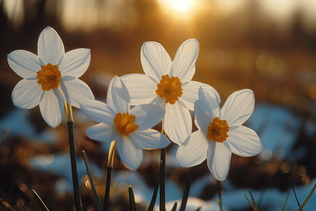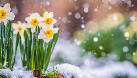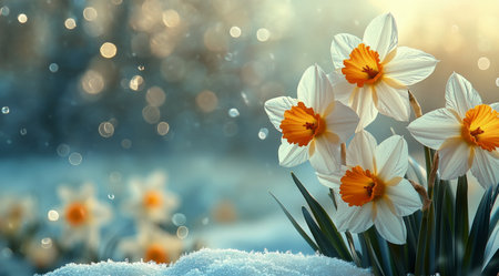 Bright daffodils with yellow and white petals emerge from a snowy ground, showcasing springs arrival. Soft sunlight creates a dreamy atmosphere, highlighting natures beauty.