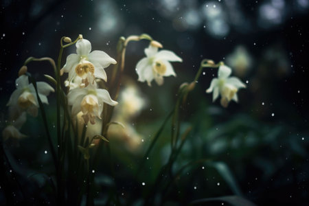 Spectral white wild orchids shimmer in darkness. Generative AI illustration