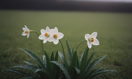 Vibrant digital illustration with soft overcast lighting and glistening raindrops, capturing an invigorating fresh spring mood. Ideal for commercial uses in seasonal greeting cards, advertising, home decor prints, and gardening publications. Suited for designers targeting themes of renewal, vitality, and natural freshness. . AI-generated digital illustration. AI-generated illustration.