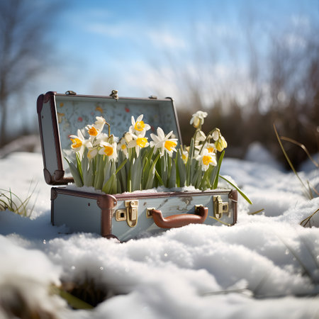 Vintage suitcase with spring flowers and blooms lying on the meadow with the rests of melting snow and grass growing. Concept of spring coming and winter leaving.
