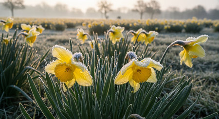 Yellow daffodils in a field covered with frost in winter